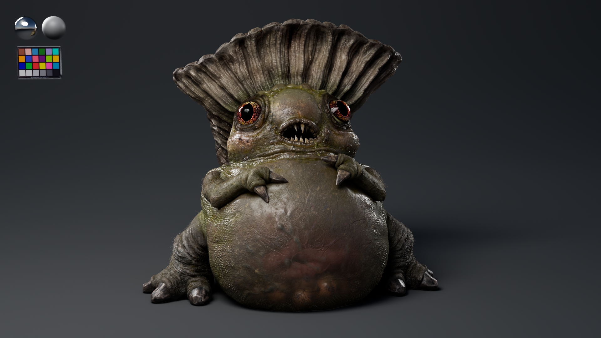 Here’s a character that I’ve been working on outside of freelance work. The point was just to do a little creature for fun that involved a lot of organic texturing details that I don’t normally get to do professionally. I do plan to put it into a proper scene eventually. I was going for a creepy-cute aesthetic and mixed in some elements of frogs/toads, dinosaur arms, elephant legs, mushroom head, and a shell for the back.